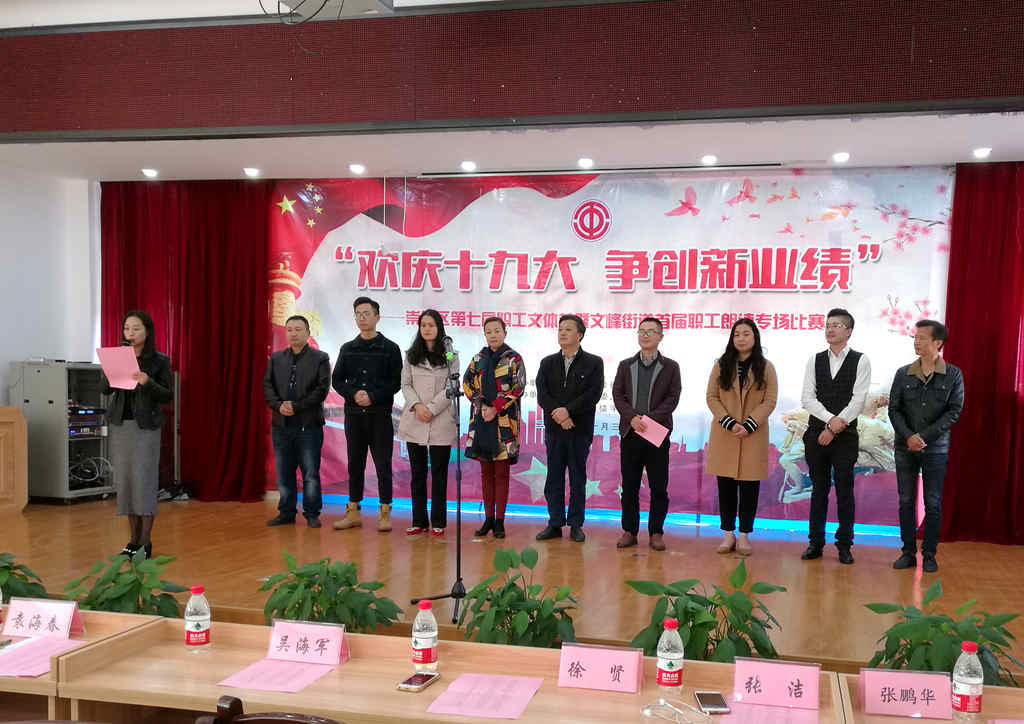 近日,由崇川区文峰街道总工会主办,五一社区党委、工会联合会及文峰街道楼宇驿站联盟承办的“欢庆十九大 争创新业绩”崇川区第七届职工文体节暨文峰街道首届职工朗读专场比赛,在五一社区二楼大会议厅举行。来自文峰辖区20多家企业的职工朗读爱好者以及领队、特邀嘉宾共80多人参加了本次活动。崇川区总工会主席吴海军、副主席袁海春、文峰街道党工委副书记街道总工会主席徐贤、南通市曲艺家协会副主席崔怀美等领导也应邀出席。